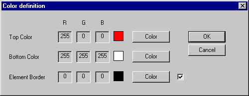 In this dialog colors for the top and bottom side of a relief map can be defined. For drawing the relief map, the plane is divided into many triangles. The border color of these triangles can also be defined. The checkbox indicates whether the borders are displayed or not.