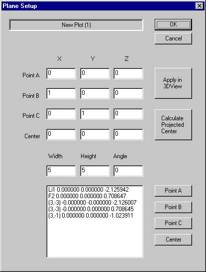 | Apply in 3DView: | Press this button to display the plane in the 3DView window. If you press "Cancel" after apply, your settings are rejected. |