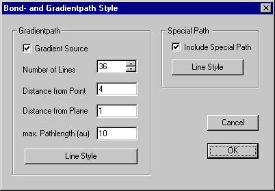 GeneralOK: Press this button to close the dialog and create plot with the current parameters. Cancel: Press this button to close the form and to reject any changes except line style parameters. Line Style: Press this button to open the Line Style form. Define the size, color and style either of Gradient Path or Special Path. Gradient Path Line PropertiesGradient Source: The checkbox indicates that the selected points are used as source for gradient paths. Number of Lines: This value represents the number of gradient paths originating at each critical point. The lines will start equally spaced from the point coordinates. If the point is out of plane, the paths will be projected onto the plane. Distance from Point: Circle around the point from where the drawing of gradient paths start. Distance from Plane Maximum allowed distance for a point/gradient path to be projected onto the plane. Max. Path length: If the actual gradient path length exceeds this value, the calculation of points for this path will stop. Special Path Line PropertiesInclude Special Path: If checked, all special paths going uphill from the selected point will be displayed.  |