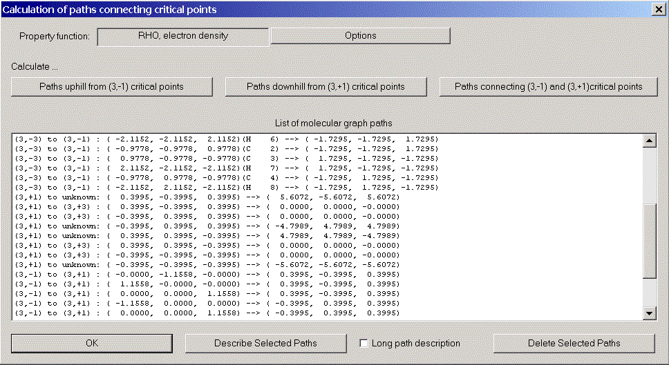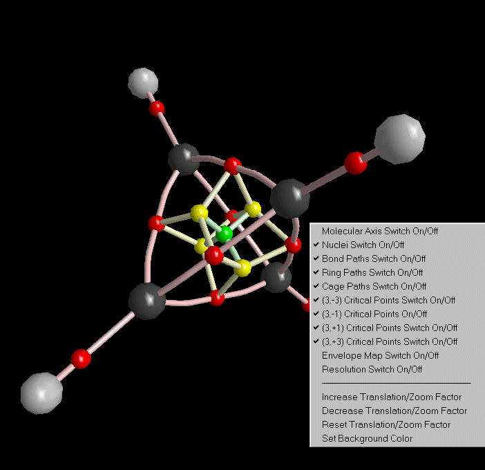 Now we try to establish the molecular graph, i.e. those gradient paths which connect critical points. Choose "Molecular graph" from the caluclation menu. There are three kinds of molecular graph paths: