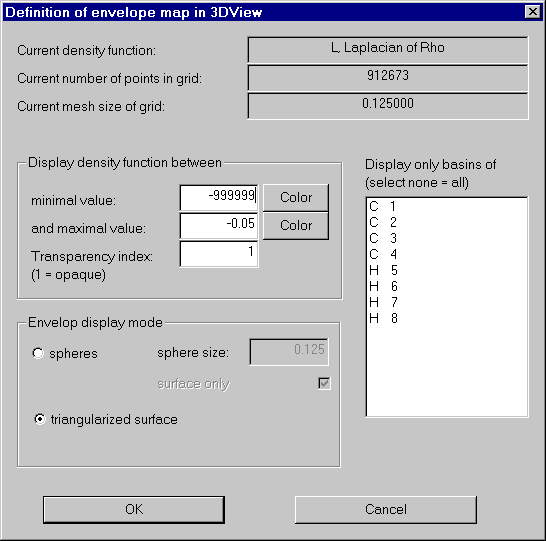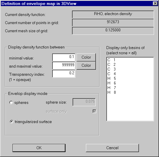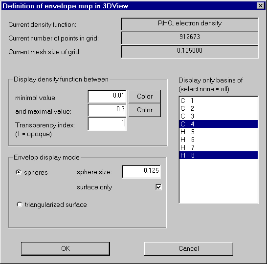 Back into the envelope definition dialog. We now restrict our picture to the atoms C4 and H8, switch off transparency, and use spheres for display.
