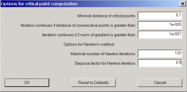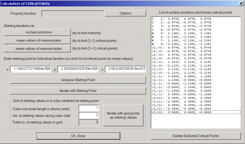 The critical point dialog appears. The main difficulty in calculating critical points is the choice of starting values for Newton's method. AIM2000 supports you by providing some power methods (Starting iterations at ...):