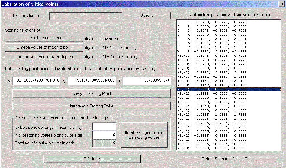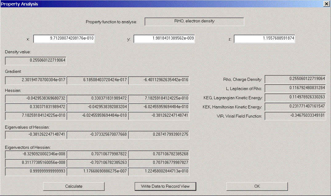 We now would like to have a look at some properties of one of the (3,-1) - critical points. Choose one from the list. Its coordinates appear in coordinate areas. Click "Analyse Starting Point" to open the "Properties of density functions" - dialog. Various properties of the chosen point are displayed.