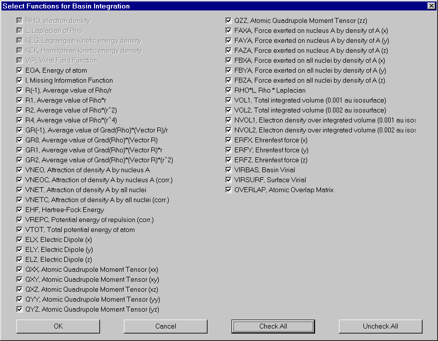 If you want to change the number of functions integrated, click "Functions". Select and deselect functions in the appearing dialog. For definitions of these functions, see AIM2000 user's guide.