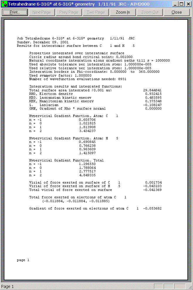 Again, via the Record menu, we can get a record and a print preview of this interatomic surface.